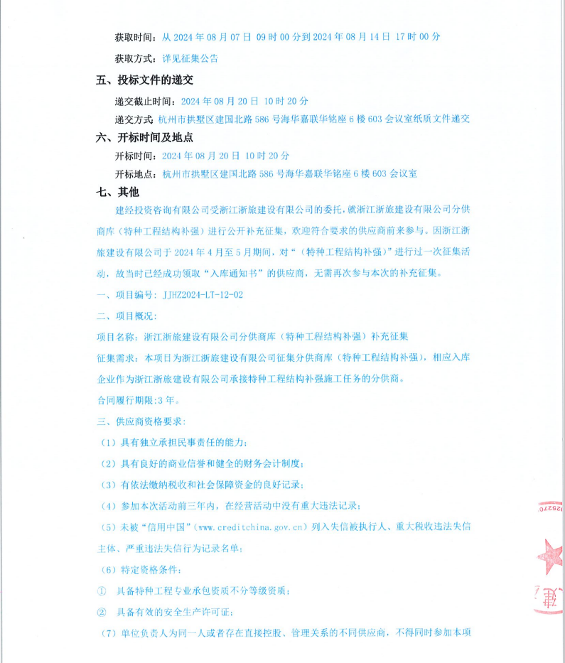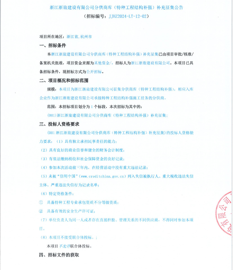 浙江浙旅建設有限公司分供商庫(特種工程結構補強)補充征集公告