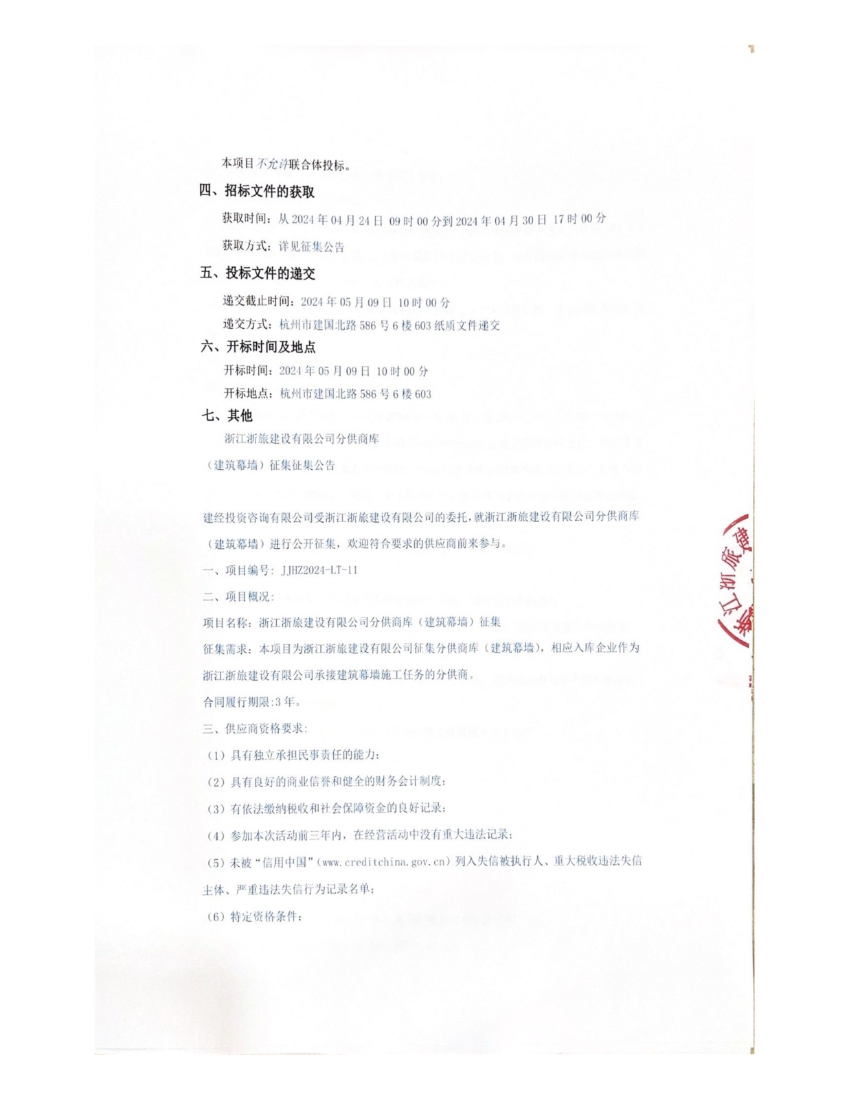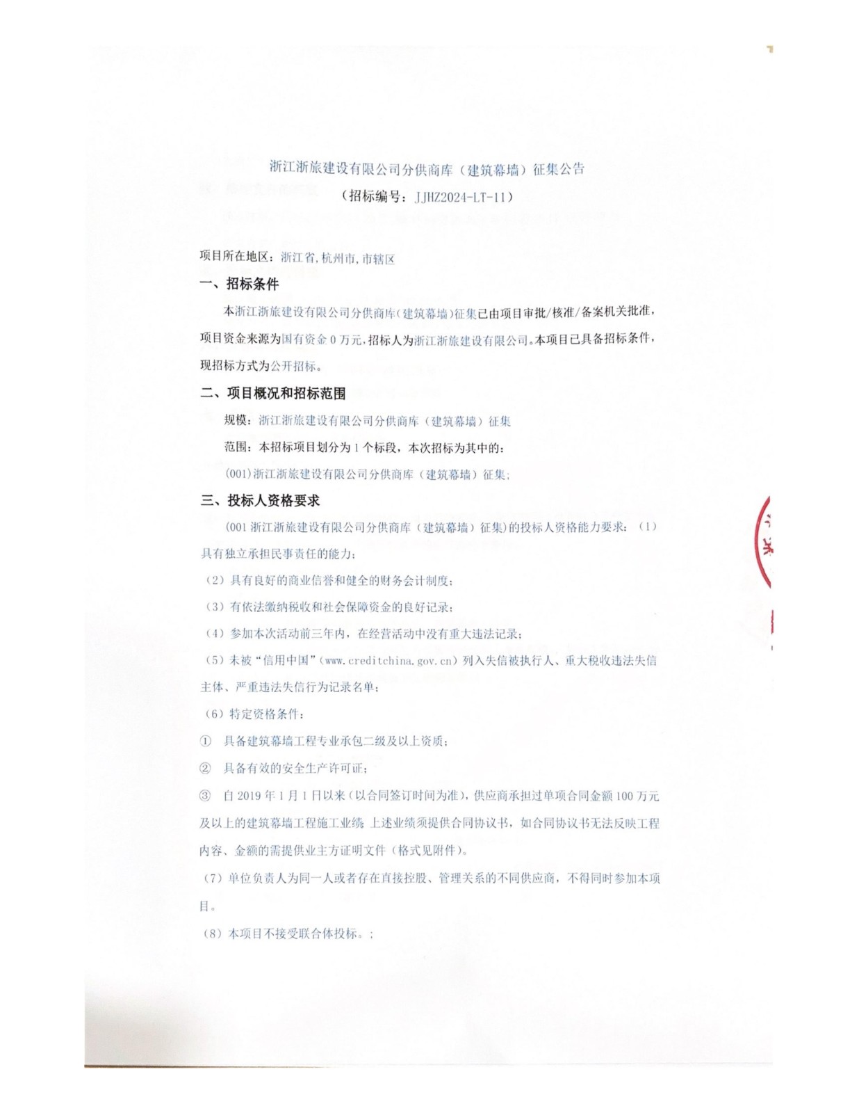 浙江浙旅建設(shè)有限公司分供商庫(建筑幕墻)征集公告