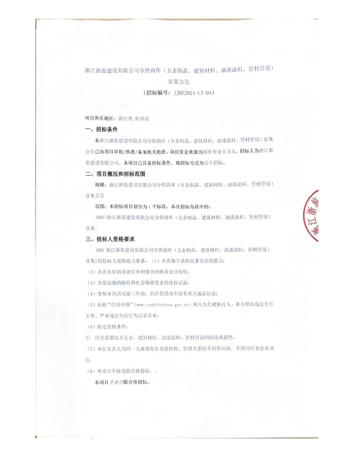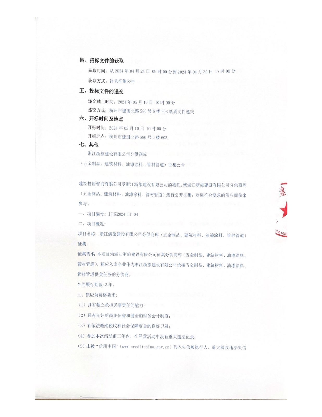浙江浙旅建設有限公司分供商庫(消防設施)征集公告
